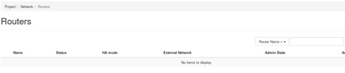 So, let’s get started. As we did in the previous posts, we will use the OpenStack web interface to build everything. After logging into the dashboard, click in the left nav on the network line in the projects section, which will expand and show the routers option. After clicking on routers, we will see the Routers page: