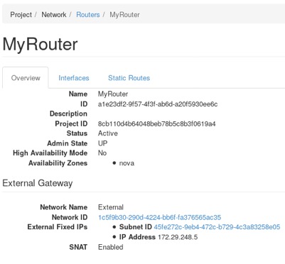 We now see that our router has a status of active and that the external interface has been configured with an available public IP in the External Gateway section. Also, at the bottom of this section, it shows that Source Network Address Translation (SNAT) is enabled, so that once we add our private subnet into the router, the SNAT table will be created and it will be able to route traffic.