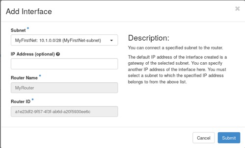 Now, select the private subnet (MyFirstNet-subnet) from the pull-down menu under the Subnet heading. Clicking on the Submit button will cause our subnet to be added into the router. We will be returned to the Interfaces page and our private subnet will appear as one of the interfaces in the router. It will be the one showing Internal Interface under the Types column. Since we weren’t able to name the interface when we created it, OpenStack will use the first 10 characters of its UUID as its name.