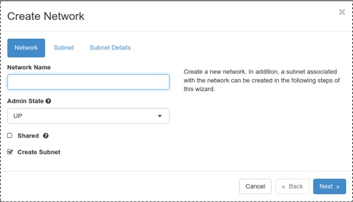 We will create both our network and a subnet from this window. Into the Network name box, enter a network name. I will use “MyFirstNet” as a name and click on the next button to define the subnet we will use. We can see this in the graphic below: