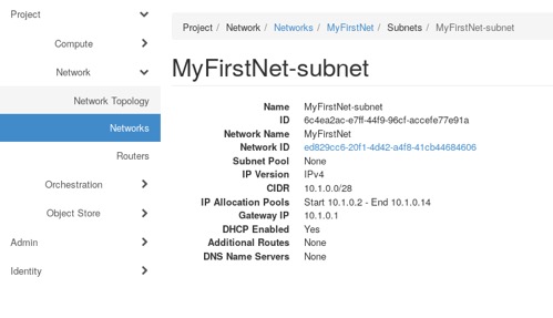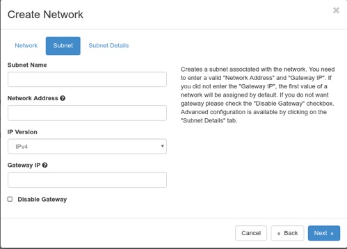 Let’s name this subnet “MyFirstNet-subnet” and enter that into the Subnet Name box. Enter a CIDR address of 10.1.0.0/28 into the Network Address box (this will give us about 11 to 13 usable addresses for instances). We will use the default gateway address of 10.1.0.1 for this subnet so we can leave the Gateway IP box blank. Click on the next button and see the Subnet Details box open as: