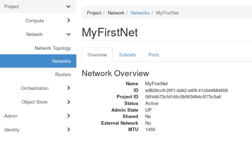 Let’s take a close look at what we just created. The OpenStack dashboard gives us the tools to look at the details of each item. After the network and subnet were created, the dashboard returned us back to the main network page, except now the newly created network shows on the page. The name, “MyFirstNetwork,” is a hyperlink that if we click on to will take us to a page showing all the information related to the network as seen below: