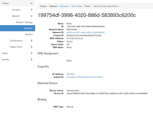 Here we can see the information about this port, including the UUID’s of the associated network and subnet, the port’s MAC and IP addresses and that the port is in an active status.